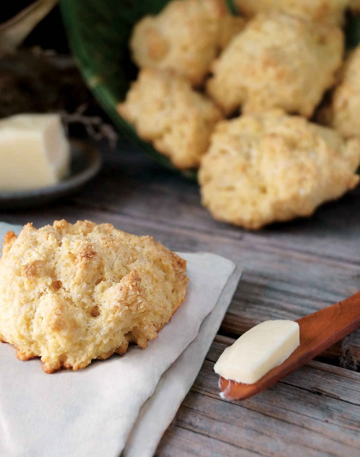 Drop the mixture onto the prepared baking sheet, 1/4 cup at a time, leaving about 2 inches between each to accommodate spreading as the biscuits bake. Bake for 25 to 30 minutes, or until the tops of the biscuits are golden brown.